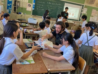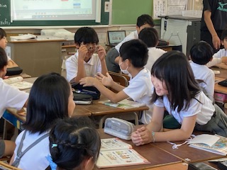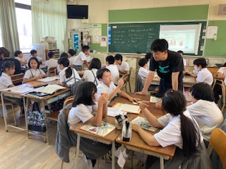 5年生の子どもたちの英語学習の様子です。お互いに好きな教科を尋ね合っています。『好きな教科な何?』『私が好きなのは○○』『どうして?』『あなたはどう?』…、グループになって順番に交代しながら進めていきます。教科までは英語で言えるのですが、理由を英語で答えるのはなかなか難しいですね。でもなんとか身振り手振りも交えながらやっていくと楽しくなってくるから不思議です。マイケル先生も大人気です。