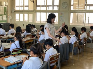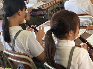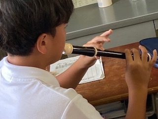 5年生の教室から楽しそうなリコーダーの音色が聞こえてきました。子どもたちが先生の手拍子に合わせてリコーダーを吹いています。パート別に分かれてお互いの音色や旋律の特徴を確かめたり、音が重なり合う響きを味わったりすることが目標です。[リボンのおどり]と[勇気100%]の曲を披露してくれました。どちらもリズムよく上手でしたよ。