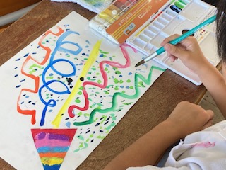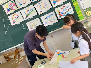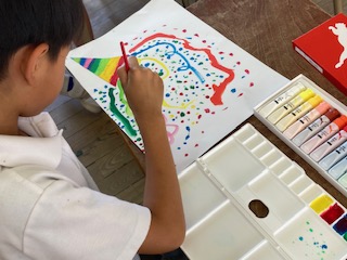 2年生の子どもたちの初めての絵の具を使って仕上げた作品[クラッカー]です。カラフルなクラッカーの中から、勢いよくこれまたカラフルなリボンや紙ふぶきが一斉に飛び出しています。子どもたちはできるだけ楽しくハッピーなクラッカーにしようと、使う絵の具の色も増やしていました。筆をくるくるさせたりちょんちょんさせたりして、自分だけのクラッカーを表現しています。全員のを集めたら、さあパーティーの始まりですね。『絵の具は楽しい?』と聞いてみたら『うん楽しい!』と答えてくれました。