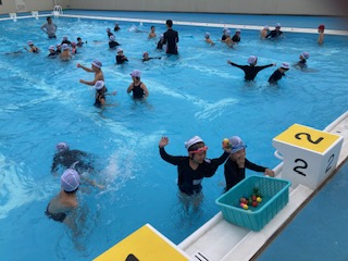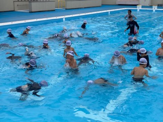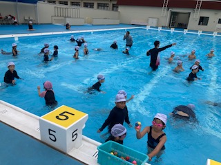 1年生の子どもたちが[宝さがし]をして楽しんでいました。先生たちがプールの中に投げ入れたお宝を子どもたちがゲットしていきます。もぐって手でつかんで取る子もいれば、足の指で器用にはさんで取る子もいます。たくさん手に持っている子もいれば、全然取れない子もいます。勝負は1組対2組で行いました。運動会の玉入れの時のようにみんなで大きな声でお宝を数えます。結果は1組の大勝利でした。子どもたちは『もう一回やりたいーっ!』と盛り上がっていました。