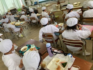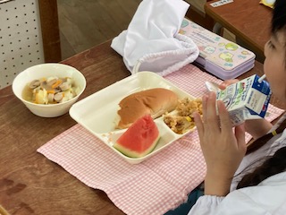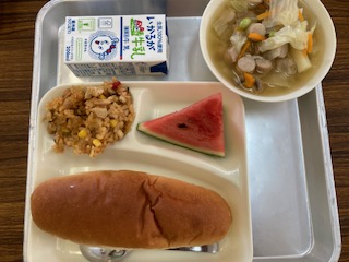 今日の給食のメニューは、チキンパエリア、ウインナーとキャベツのスープ、すいか、牛乳、パンでした。チキンパエリアは鶏肉を主材に、細かく刻んだたまねぎとピーマン、コーンをにんにくで香りよく炒めて、お米と一緒に蒸し焼きにしています。少しカレー味にしているので子どもたちの好きな味になっています。ウインナーとキャベツのスープは彩りもよく、具材がいっぱいの洋風仕立てのスープでした。すいかは夏の到来を感じさせます。