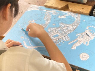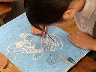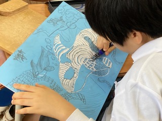 6年生の子どもたちが彫刻刀を使って版画作品に取り組んでいました。海の中の生き物たちをもとにして、さまざまな模様をアレンジしながらデザイン化しています。近くで見てみると、かなり細かな下描きでした。版画で表現すると、そのよさがさらに際立ちそうです。完成はまだまだで2学期に持ち越しとなりますが、最後までていねいにやり遂げてほしいです。あと驚いたのが版画板がベニヤ板(木材)じゃないんですよ。写真をよく見ると彫った跡が白いでしょ。発泡スチロール?のような感じで彫りやすいようです。いろんな教材が開発されているんですね。