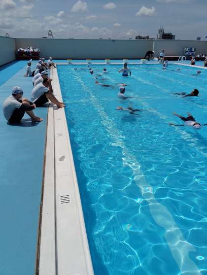 着衣泳で大切なことは、服を着たまま上手に泳ぐことではなく、助けが来るまで「あわてずに、浮いて、待つ」ということです。いかに体力を温存できるかが大切です。早速、楽に体を浮かす方法を練習しました。