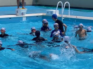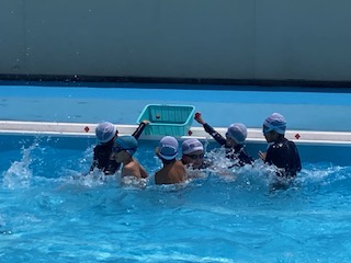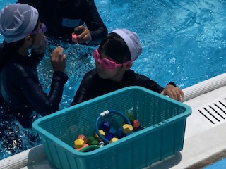 2年生の子どもたちが夏の太陽の日差しをいっぱい浴びながら、勢いよく水しぶきを上げています。屋上プールには子どもたちの楽しそうな笑い声が響いています。宝さがしは子どもたちの大好きな遊びで、自然に水慣れできるもってこいの遊びです。一度に一人2個までしか手に持てないルールなので、すぐにかごに入れて次に向かわないといけないのでよりハードなゲーム仕様となっています。子どもたちは1個でも多くゲットするために水の中を走ったり潜ったり…。とにかく元気いっぱいの様子でした。