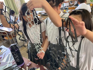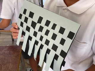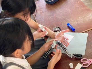 4年生の子どもたちが図工の授業で、[モノクロの世界]というテーマで工作をしていました。モノクロというと[白と黒]を連想しますが、赤や青などでも単色(1色)で印刷されていればモノクロと言えるらしいです。ただ今回は白と黒、灰色を使っていました。子どもたちはハサミとのりを使って、いろいろな形や模様の作品を作り上げていきます。偶然の産物もたくさんあってバラエティに富んでいました。作品ができたら先生や友だちと見せ合いっこをして、作り方を教えてあげたりお互いに感想を伝えたりしていました。