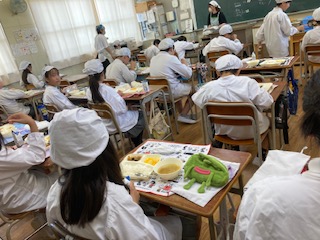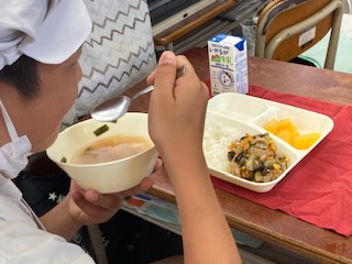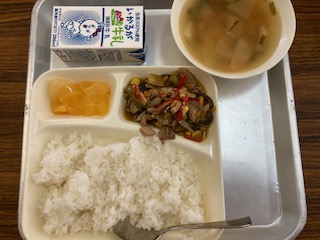 今日の給食のメニューは、夏野菜飯、パワースープ、トロピカルゼリー、牛乳でした。今日の給食は令和5年度大阪市学校給食献立コンクール優秀賞に選ばれた献立です。夏野菜飯は焼き豚となす、赤ピーマンなどの夏野菜をごま油で香りよく炒め、塩こしょうとしょうゆ、中華スープの素で味つけをした具をごはんの上にのせて食べます。パワースープは鶏肉を主材にして冬瓜、トマト、にらを使い、チキンスープをベースにしています。トマトの酸味がアクセントになっていました。トロピカルゼリーはみかんゼリーとミックスフルーツ(缶)を合わせたものです。今日で1学期の給食が終わりました。学校給食にご理解ご協力をいただきありがとうございました。子どもたちも好き嫌いなくしっかりと食べることができたと思います。引き続き、2学期も安全でおいしい給食を提供していきたいと思います。