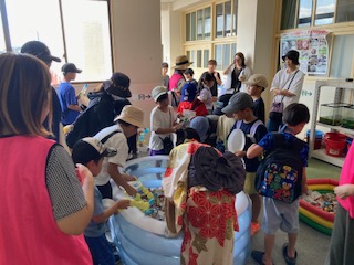 今日、17日(土)15時より夕方の時間を使って、サマーフェスティバルが行われました。大桐中学校の吹奏楽部の迫力ある演奏で始まり、かっこよく演奏したり踊ったりする先輩たちの姿がとても素敵でした。楽しいゲームコーナーや手作り工作コーナーがいくつも準備されていて、また子どもたちの大好きなたこせんべいとジュースもありました。子どもたちは所せましと走り回っていました。そして久しぶりに顔を合わせた友だちとの会話もはずみ、自然と笑みがこぼれていました。最後にはお楽しみの抽選会も開かれて、自分の番号が呼ばれないかとワクワクドキドキ、とても盛り上がりました。猛暑が続き、なかなか夏休みに行事をすることも難しい中で、何か夏のイベントとして子どもたちの喜ぶことをしてあげられないだろうかと、PTAをはじめ、地域、各諸団体の方々が計画と準備をしてくださいました。本当に皆さまの愛情がたくさん詰まった、和やかで温かい雰囲気の中、子どもたちにとってとてもよい夏の思い出ができました。中心となって進めていただいた方々、こころよくお手伝いをしていただいた方々、皆さま、本当にありがとうございました。そしてお疲れさまでした。とてもよい行事となりました。ありがとうございました。