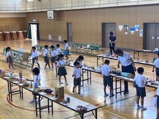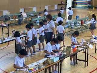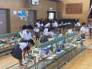 1年生の子どもたちが講堂に展示している夏休み作品展を鑑賞しています。『すごいのがあるよー』『かわいいー』『これほしいー』『ちょっとこっちきてー』『どうやって作ったのかなあ』『じょうずやなぁ』『これお姉ちゃんが作ったんだよ』…。たくさんの感想が聞かれました。1年生の子どもたちにとって、お兄さんお姉さんの作品はキラキラ輝いていて、きっと心が動かされるのでしょうね。気になる作品を見つけてはお友だちや先生に紹介していました。もちろん自分が作った作品の宣伝も忘れずにいっぱいしてくれました。保護者の皆さまにも、たくさん来ていただいています。30日(金)午前11時まで行っていますので、ご都合がつきましたらよろしくお願いいたします。