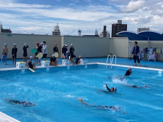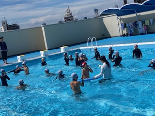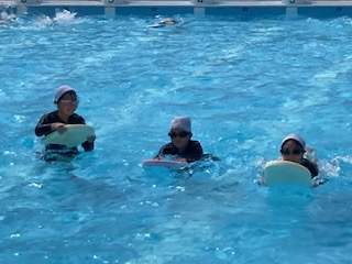 4年生の子どもたちがプールに入っています。台風の影響などまったく感じられない午前中となりました。強い太陽の日差しを浴びながらも、子どもたちは水の感触を楽しんでいます。1学期に練習したことを思い出しながら、バタ足やクロールを中心にしっかりと体を動かしました。来週は4年生としての記録を取るそうです。子どもたちも張り切っていました。そうかと思って違う方向を見てみたら…あらま、ゆらゆらぷかぷか、ユラユラプカプカ…どこかの市民プールにでも遊びに来た雰囲気をかもし出している3人娘が波間に見え隠れしていました。おー気持ち良さそうですね。