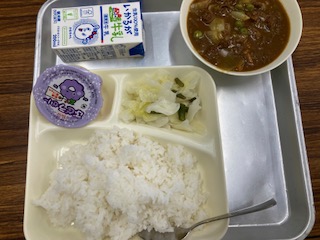 今日の給食のメニューは、ビーフカレーライス、野菜のピクルス、ぶどうゼリー、牛乳でした。ビーフカレーライスは牛肉の旨みが十分に感じられるまろやかなルウに、じゃがいもや玉ねぎ、にんじんなどの野菜もしっかりと入っていました。野菜のピクルスはワインビネガーでさっぱりとした味わいに仕上げています。ぶどうゼリーは2口サイズくらいの小さなゼリーでした。