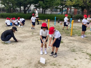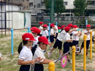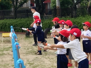 水をたくさん入れて、ぎゅっと強く押したら遠くまで飛び出した!1年生の子どもたちがお家からペットボトル、マヨネーズや台所用洗剤の容器などを持ち寄って夏遊びの続きです。的当てをして遊びました。やわらかいペットボトルは一度へしゃげると元に戻らないので、水とばしには不向きということがわかりました。かたいペットボトルはなんとかOKです。でもやっぱりマヨネーズとケチャップの容器が1番でした。遊びを通して、そういうことにも気づくことができました。1年生の子どもたちのはしゃいでいる声が運動場に広がっていました。