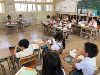 2年生の道徳の授業の様子です。読み物教材を使って、思ったことや感じたことをお互いに伝え合ったいます。先生を中心に、机の配置をコの字型にすることで、みんなの顔がよく見えます。顔がよく見えると、友だちがどんなことを考えてどんなふうに発表しているのかがよくわかります。するとだんだん自分も発表したい気分になってきます。発表が増えると内容が深まり、その分気持ちも揺れ動かされていきます。気持ちが揺れ動くと心が成長して豊かな感情の持ち主になっていくと思います。だからたくさんたくさん自分の思いを伝えていってほしいと思います。
