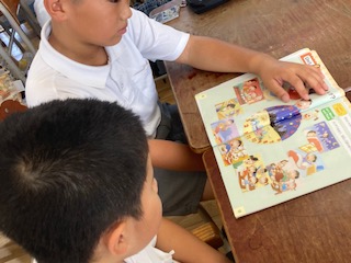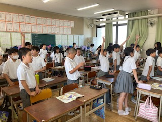 4年生の子どもたちが昼から英語活動です。給食を食べてちょっと眠たそうかも。それでも先生の質問には頑張って答えていました。[○時にすることは・・・です][いつも・・・するのは○時ごろです]…寝るのは?起きるのは?学校に行くのは?遊びに行くのは?など、時間と日課を組み合わせて英語でコミュニケーションをとっていました。チャンツ(英語歌)では音楽に合わせて指先でリズムをとりながら口ずさんだりジェスチャーしたりする様子も見られました。