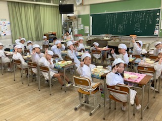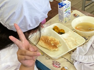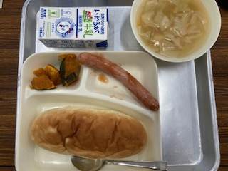 今日の給食のメニューは、ウインナーのケチャップソース、スープ、焼きかぼちゃ、牛乳、パンでした。ウインナーのケチャップソースはウインナーの皮はパリッと中はジューシーで、ケチャップもとろみのある特製でおいしかったです。スープはチキンスープをベースに鶏肉と細かく刻まれた野菜が入っていて、やさしい味に仕上がっていました。焼きかぼちゃはかぼちゃのもつ本来の自然の甘さが味わえました。かぼちゃにはカロテンという色素が含まれ、風邪の予防や目の疲れを防ぐ、皮膚の乾燥を防ぐなどのはたらきがあるそうです。