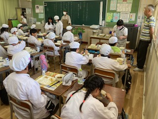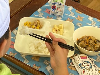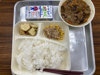今日の給食のメニューは、麻婆茄子、ツナと野菜の炒め物、焼きさつまいもの甘みつかけ、牛乳、ごはんでした。麻婆茄子は牛豚ひき肉の旨みとトウバンジャンの風味を生かし、旬の茄子もおいしかったです。ごはんにかけて食べている子もいました。ツナと野菜の炒め物はツナの他にもやしとコーンを使い、塩こしょうと醤油で味つけしています。焼きさつまいもの甘みつかけはみつが甘くて、子どもたちも『甘すぎる〜』と喜んでいました。