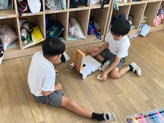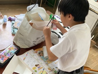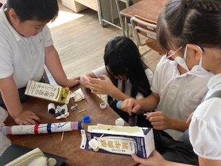 2年生の子どもたちがなんだか忙しそうです。生活科の学習で[おもちゃづくり]に取り組んでいました。材料を選んだり作り方を工夫したりして、自分だけのおもちゃを作っています。教科書には参考例としていくつかのおもちゃの作り方が載っているので、まずはそれを真似て試してみる子が多かったです。でも中にはさっそく独創的にどんどんイメージをふくらませながら作り始めている子もいました。お家から大量の材料を持ってきて意欲100点満点です。出来上がったら、みんなで楽しく遊んでくださいね。