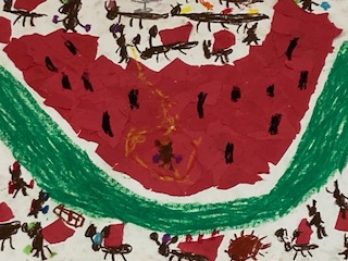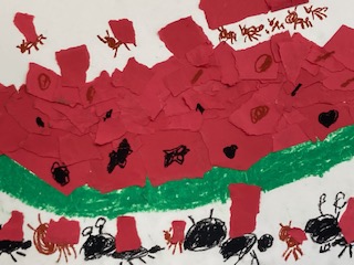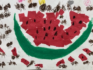 1年生の教室の後ろに楽しそうな絵が掲示してありました。『ありとすいか』という絵本を題材にして、1年生の子どもたちが描きました。先生に絵本を読み聞かせしてもらったり、自分でも読んたりして、自分なりの世界観を作りながら描きました。すいかの実の部分は貼り絵となっています。ありさんたちが一生懸命に運んだり、美味しそうに食べたり、うれしそうに踊ったりしているように見えます。