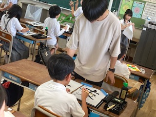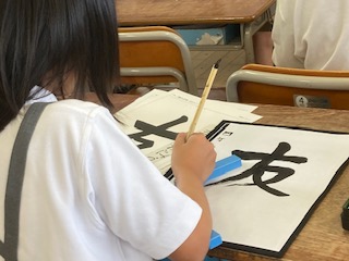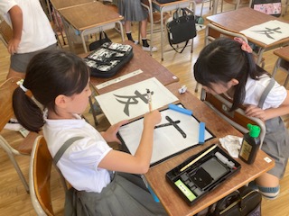 4年生の子どもたちが習字で毛筆の練習をしていました。一文字で『友』です。お手本を見ながら筆を立てて、ていねいに動かしていきます。みんな集中して背筋もピンと伸ばして頑張っていました。端っこに小筆で名前を書くのですが、4年生なのでまだ上手に書けなくて、ほとんどの子がかなり大きなサイズ感になってしまっていたのがおもしろかったです。先生も子どもたちのところを回りながらアドバイスしていきます。早く終わった子がまだの友だちを応援(もしかして邪魔?)している姿も見られました。