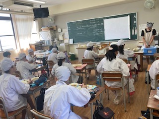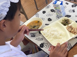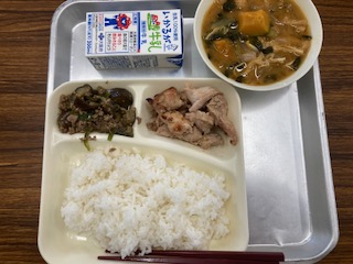 今日の給食のメニューは、鶏肉の照り焼き、かぼちゃのみそ汁、なすのそぼろ炒め、牛乳、ごはんでした。鶏肉の照り焼きは料理酒と砂糖、みりんや醤油で下味をつけた鶏肉を香ばしく焼き物機で焼き上げています。かぼちゃのみそ汁はかぼちゃの甘みがとけ出して、子どもたちの好きな味になっていました。うすあげ、たまねぎ、小松菜も入っていました。なすのそぼろ炒めは生姜の香りが効いていて、ごはんのお供でした。