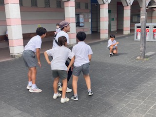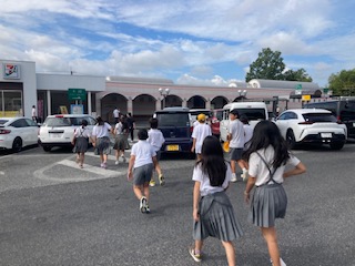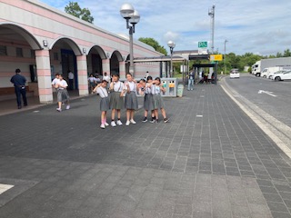 途中、赤松PAでトイレ休憩しました。子どもたちは体を伸ばしたり深呼吸したりしてリフレッシュしています。元気です。トイレに行くだけなのに…、いつも一緒にいるのに…、お互いに手を振り合ったりハイタッチしたり…。先生たちは駐車場で車が来ないか確認しています。