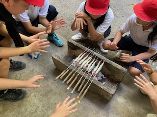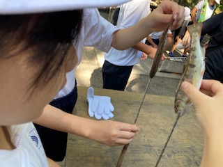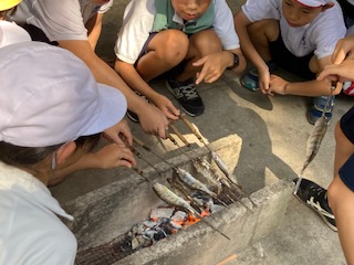 つかまえたアマゴを自分の手で串に刺していきます。串に刺すのもコツがあり、やみくもにしても上手くいきません。これも体験ですね。地元の方々にそのコツを教えてもらいます。塩をふり炭火にかざして、しっかり焼けるのをしばらく待ちます。川で冷えた体も乾かします。一石二鳥です。魚の焼けた、いいにおいがしてきました。『焦げ目が十分につくまで触らない』という指示があるのですが、どうしても子どもたちは自分のアマゴを自分で育てたいみたいで、常にクルクル回してしまいます。