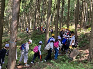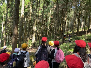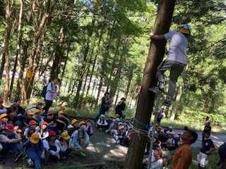 25〜30mの大木が子どもたちの目の前を大きな音をたてながらゆっくりと倒れていき、最後には地響きを感じました。地元森林組合の方々がデモンストレーションとして、木を一本切り倒してくれました。子どもたちからはその迫力に思わず大きな拍手が起こりました。その他にも枝打ちに必要なはしごの説明や登り方についても教えてくれました。教科書では何となく習う内容ですが、実際に見学するとさらによくわかりますね、