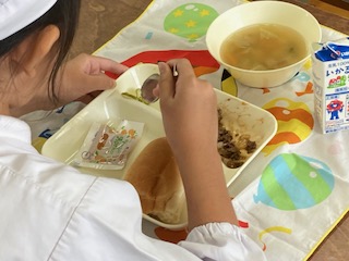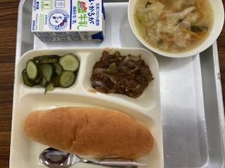 今日の給食のメニューは、牛肉のソース煮、スープ、きゅうりのピクルス、牛乳、パンでした。牛肉のソース煮はにんにくを香りよく炒めて、ワインで下味をつけた牛肉、たまねぎを炒めて煮込み、水とき上新粉でとろみをつけ、トンカツソースやウスターソースなどで味つけをしてまろやかさを出しています。スープはウインナーの旨みを生かしたチキンスープをベースにしていて、じゃがいもとキャベツ、にんじん、彩りにパセリを使っています。きゅうりのピクルスはさっぱりとした口あたりでした。