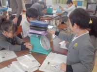 『島ひきおに』というお話を題材にした2年生の子どもたちの作品です。絵本を読んだことがある人たちも多いと思います。人間と仲良くなりたい鬼が一生懸命に島を引っ張るという、何とも切ないお話です。でも子どもたちの描いた鬼はどこか楽しそうです。一緒に遊ぶ人間を求めて島を引っ張っている鬼の気持ちが表れているからでしょうか。2年生の子どもたちらしい作品に仕上がっていますね。背景はえのぐで、鬼と島は貼り絵で構成されています。揺れる波間に映る夕陽がいい雰囲気をかもし出しています。