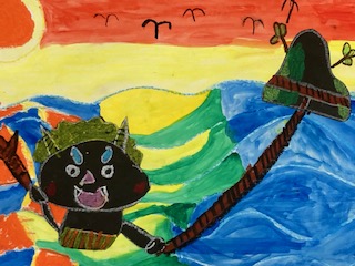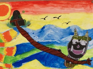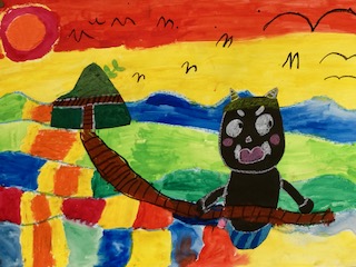『島ひきおに』というお話を題材にした2年生の子どもたちの作品です。絵本を読んだことがある人たちも多いと思います。人間と仲良くなりたい鬼が一生懸命に島を引っ張るという、何とも切ないお話です。でも子どもたちの描いた鬼はどこか楽しそうです。一緒に遊ぶ人間を求めて島を引っ張っている鬼の気持ちが表れているからでしょうか。2年生の子どもたちらしい作品に仕上がっていますね。背景はえのぐで、鬼と島は貼り絵で構成されています。揺れる波間に映る夕陽がいい雰囲気をかもし出しています。