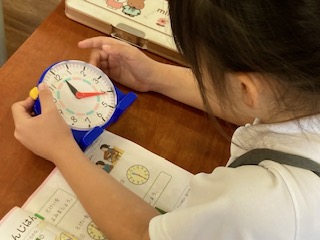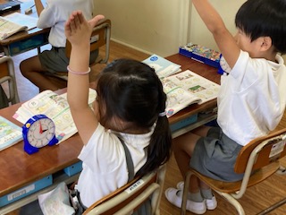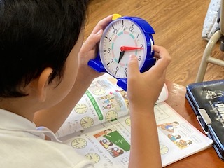 1年生の子どもたちが算数の授業で時計の読み方を勉強していました。今回は[なんじ]と[なんじはん]です。先生が見本の時計の針を動かすと『そんなんかんたんやー』『ぼくとけいよめるもん』『いつも7じにおきてるからー』…と口々に言葉が出てきます。今度は反対に先生が時間を言って子どもたちがその時間に時計の針を合わせていきます。ダイヤルを回して、長い針と短い針をクルクルクルクル。『できたー』『かんたんやわー』『もっとむずかしいのだしてー』…。本当は[なんじはん]までだったのですが、細かく[なんじなんぷん]まで出してあげると、子どもたちは大喜びしていました。