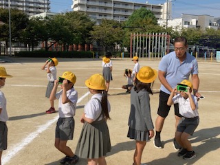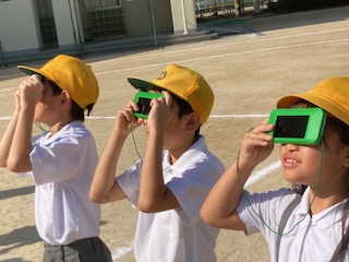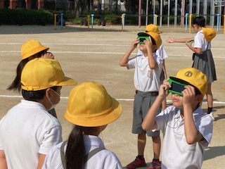 [かげはどんなところにできるのだろうか][太陽の位置と関係があるのだろうか]…3年生の理科の学習です。子どもたちが太陽を観察するための遮光板(しゃこうばん)を持って運動場に出てきました。はじめは遮光板を通して太陽を観察するところからですが、子どもたちは黒いレンズに青白く映る太陽を見て、『太陽が見えたー!』と喜んでいました。次は本題の[かげのでき方]です。いろいろみんなで試したり考えたりした結果、[かげは太陽の光をさえぎるものがあると太陽の反対側にできる]ということがわかりました。