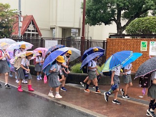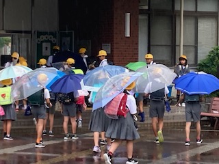 子どもたちの登校時に雨が降っているのは久しぶりな感じがします。色とりどりの小さな傘がくるくる回りながら校舎へと向かって進んでいきます。雨の中の登校風景もなかなかいいものです。今日は運動場での練習や遊びはできなさそうです。教室で落ち着いておだやかに過ごしてほしいと思います。最近は台風や大雨などの風水害が全国各地で起こり、災害に対する防災意識や備えが大きな課題となっています。子どもたちにも機会あるごとにそんな話をしています。ご家庭でもいざという避難時や取るべき行動などについてお話ししていただければと思います。