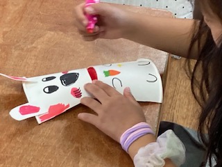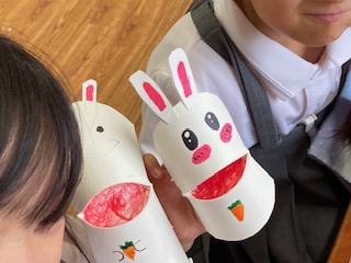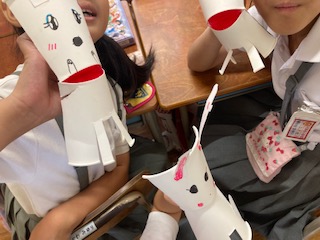 1年生の子どもたちが『ぱくぱく人形』を作っておしゃべりしています。紙コップを上手にハサミで切ると、あら不思議。底の部分がちょうど口のようになりました。子どもたちは紙コップに動物や模様を描いて、器用に口を開け閉めします。ねえねえお話しましょう。