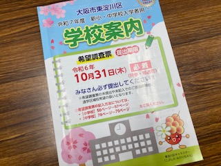 ・東淀川区役所より配布されている[学校案内]には、10月6日(日)と記載されていますが、諸般の事情により10月19日(土)に変更となっています。どうぞご理解いただきますよう、よろしくお願いいたします。
