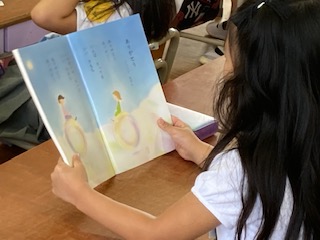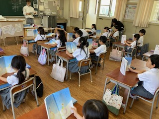 1年生の国語の[下]の教科書の一番はじめに載っている詩です。子どもたちの元気で大きな声が教室中に響きわたっています。『ありがとう』って自分も友だちもうれしい気持ちにさせる魔法の言葉だね。これからも大切にしながらいっぱい使っていきましょう。