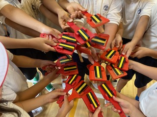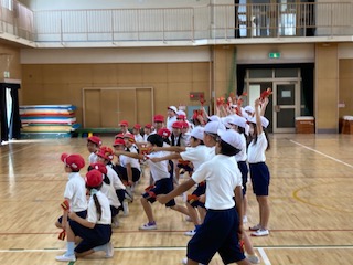 今日は雨は降っていないのですが、運動場の状態が悪いので外で練習ができません。講堂から『カチカチカチカチ』という音が聞こえてきました。2年生の子どもたちです。どうやら2年生は『鳴子』を使うようです。鳴子はしゃもじのような形の板に小さなバチがついていて、振ると『カチカチ』と軽快な音が鳴ります。よさこい踊りなどでよく使われているのを見かけます。小さな2年生の子どもたちが鳴子を鳴らしながら踊ると、かわいらしさ倍増ですね。子どもたちも鳴子を持つとさらにうれしそうな顔をしていました。