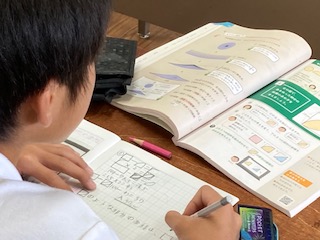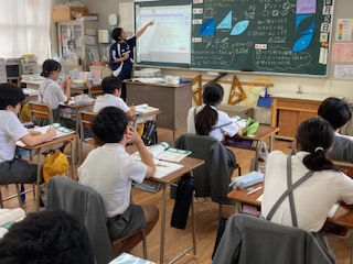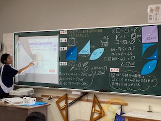 6年生の先生の授業をしている声がだんだんと大きくなっていきます。自然と熱が入ります!算数の図形の学習で、円の形(一部)が含まれる図形の面積を求めています。扇形やラグビーボールのような形、いちょうの葉のような形があります。6年生でよく出てくる問題なのですが、考え方が難しくていつも子どもたちを悩ませます。どのように解決していけばいいのか、その[考え方]が大事です。先生は子どもたちが視覚的にもわかりやすいようにパソコンの画像を見せたり、画用紙で図形を作成したりと頑張っています。もちろん黒板も目一杯使います。『こうなって この部分をこうすると こんなって だからこう考えると こうなるの わかるー? わかったー? わかったでしょーっ!』…、先生も自然と熱が入ってまーす!