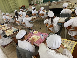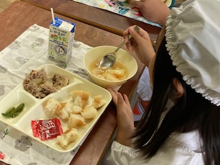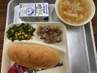今日の給食のメニューは、豚肉のガーリック焼き、鶏肉と野菜のスープ、三度豆とコーンのソテー、牛乳、パンでした。豚肉のガーリック焼きは豚肉にワインとガーリック、塩こしょう、醤油、オリーブ油で下味をつけて、玉ねぎと混ぜ合わせて焼いています。ごはんがすすむ一品です。鶏肉と野菜のスープは洋風仕立てで、じゃがいもがふっくらしていておいしかったです。三度豆とコーンのソテーは三度豆の緑があざやかでコーンの甘さがアクセントになっていました。