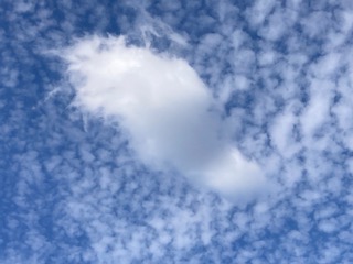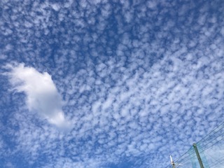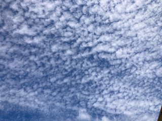 子どもたちが活動している運動場から空を見上げてみたら…、空一面に『うろこ雲』です。うろこ雲は空高くに白い小石を並べたように見える雲で、魚のうろこのようにも見えることからそう呼ばれています。『いわし雲』とも言われています。秋によく見られることから、秋の季語にもなっています。そのうろこ雲の下を『わた雲』が風に乗って流れていきます。わた雲は綿(わた)をちぎったような雲で、何となくクジラのように見えました。大空の波間を泳ぐクジラが子どもたちの様子を見ているようです。