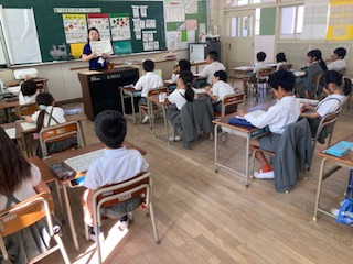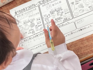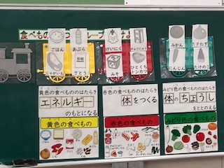 今日は他校から栄養教諭に来てもらって2年生の子どもたちに栄養指導を行いました。テーマは[食べ物を3つのグループに分けよう]です。まずはじめに黄色のグループ、赤のグループ、緑色のグループについて教えてもらいました。黄色はエネルギーのもとになります。赤色は体をつくります。緑色は体の調子を整えます。給食に出てくるメニューを参考にしながら、使われている食材や調味料などを仲間分けしていきます。元気に過ごして大きくなるためには好き嫌いせずにバランスよく何でも食べないといけないことがわかりました。最後に『がんばって食べまーす!』と子どもたちは大きな声で答えていました。