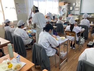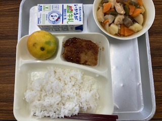 今日の給食のメニューは、みそカツ、じゃがいもと野菜の煮物、みかん、牛乳、ごはんでした。みそカツは一口トンカツをなたね油で揚げて八丁みそを使ったみそだれをかけています。じゃがいもと野菜の煮物はほんのり甘めの和風仕立てで、牛肉の代わりに鶏肉を使った肉じゃがのような感じでした。みかんは少し緑色の部分があり、極早生みかんというそうです。極早生みかんは普通のみかんと比べるとちょっと酸味が強めで、みかんの袋(じょうのう)が薄くて食べやすいのが特徴だそうです。