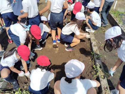 3時間目、青空の下3年生が生活科で大切に育てたさつまいもを収穫していました。大きく育ったさつまいもを掘り起こし、満足気に見せてくれました。このあとは図工科で芋はんこを作る予定のようです。どんなはんこができるか楽しみですね。