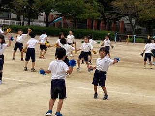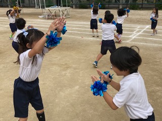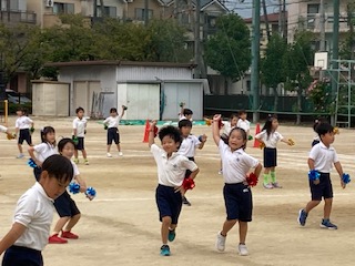 全体練習に引き続き、そのまま1年生が2時間目に練習をしていました。もうダンスもばっちり覚えました。あとは元気に笑顔で踊るだけです。音楽のリズムに合わせて、腕をフリフリ、腰をフリフリ、気持ちもノリノリの子どもたちです。1年生の先生たちも教えながら、そんな子どもたちの様子を見て、思わず笑みがこぼれていました。1年生は小学校はじめての運動会なので、精一杯楽しんでほしいと思います。