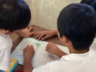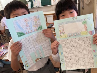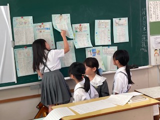 2年生の子どもたちが絵を描いて、その下に文章を書いていました。絵日記かな?と思って尋ねてみたら、違いました。国語の学習で[おはなしのつづき]だそうです。お話を読んで、その続きを自分で考えて書いていきます。だからみんなそれぞれストーリーが違います。自分が書いたお話の続きのストーリーをお友だちにも読んでもらいます。できたら黒板にも貼っていきます。お互いにお話の続きを読み合って感想を伝え合っていました。想像力が豊かになっていいですね。