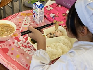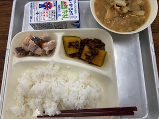 今日の給食のメニューは、鮭の塩焼き、みそ汁、かぼちゃのいとこ煮、牛乳、ごはんでした。鮭の塩焼きはサイコロ形の鮭に塩で下味をつけて焼き物機で香ばしく焼き上げています。ほぐしやすく骨もないので食べやすかったです。みそ汁は白菜がたくさん入っていて野菜中心のやさしい味でした。かぼちゃのいとこ煮はだしで煮上げたかぼちゃを砂糖、みりん、醤油で味つけして、小豆(あずき)を加えてさらに煮ています。