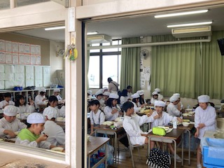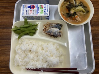 今日の給食のメニューは、さごしの塩麹(こうじ)焼き、みそ汁、枝豆、牛乳、ごはんでした。さごしの塩麹焼きは塩麹とこいくち醤油で下味をつけて焼いています。ごはんのおかずにぴったりでした。みそ汁は具だくさんで、鶏肉と白菜、玉ねぎ、小松菜、にんじん、えのきたけが入っていました。枝豆はシンプルに塩をふっています。ちなみに麹(こうじ)とは米・麦・大豆などの穀物に[麹菌]を繁殖させたもので、日本の発酵食品を作るのに欠かせないものです。食べ物をやわらかくしたり甘味や旨味を増やしたり、おいしく変化させたりするはたらきがあります。
