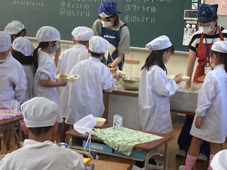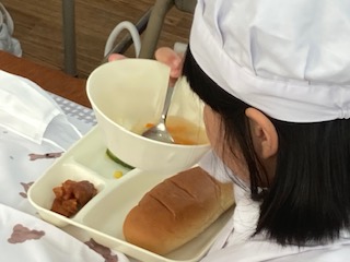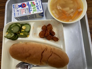 今日の給食のメニューは、まぐろのオーロラ煮、スープ、きゅうりとコーンのサラダ、牛乳、パンでした。まぐろのオーロラ煮は生姜汁で下味をつけたサイコロ形のまぐろにでん粉をまぶして油で揚げ、ケチャップと砂糖、赤みそで作ったタレを絡ませています。スープはベーコンの塩気がアクセントとなっていて、たんざく状に切ったじゃがいもがたくさん入っていました。きゅうりとコーンのサラダはほのかに甘酸っぱくさっぱりとしていました。