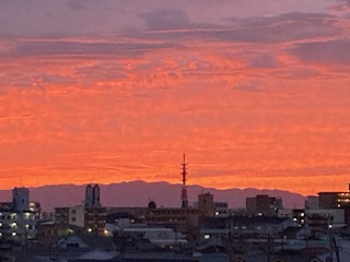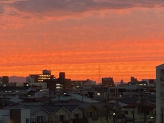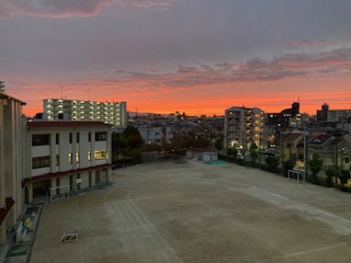 春はあけぼの…で始まる『枕草子』を書いた平安時代の清少納言は、それぞれの季節で一番よいと思う時間帯を次のように言っています。『春はあけぼの(明け方)』『夏は夜(夜)』『秋は夕暮れ(夕方)』『冬はつとめて(早朝)』…に趣きを感じます。秋は夕暮れがいいようです。昨日の夕方17:40頃に校舎の戸締まりに回っているときに見かけた夕暮れです。4階の4年生の教室前ろう下からの景色です。いつでも見られるわけではないので紹介します。大道南小学校のベストビューポイントですね。