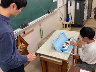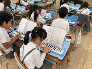 2年生の教室から鍵盤ハーモニカの音色が聞こえてきます。『山のポルカ』という曲です。ポルカは踊りの音楽なので、どういう風に演奏したら踊っている感じを出すことができるのか考えながら息を吹いたり指を動かしたりしています。子どもたち全員で演奏すると楽しい気分になってきました。しかも今日は一人ずつのテストでした。少し緊張しますが、楽しい気分のまま乗り切っていきましょう。