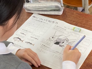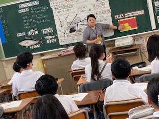 他校より栄養教諭に来てもらい、5年生の子どもたちに栄養指導を行いました。テーマは[魚について知ろう]です。魚は好きですか?…、結構多くの子たちが手をあげていました。でもやっぱり肉系の料理の方が人気があるみたいでした。魚は肉や牛乳と同じ赤色のグループで、丈夫な体をつくるための栄養素をたくさん含んでいます。また魚の食べる部位によっても体の成長や健康に与える影響は違ってきます。日本は海に囲まれていて魚をよく食べる印象がありますが、実際には意識しないと少なくなりがちですね。子どもたちもこれから魚を食べることを意識すると言っていました。